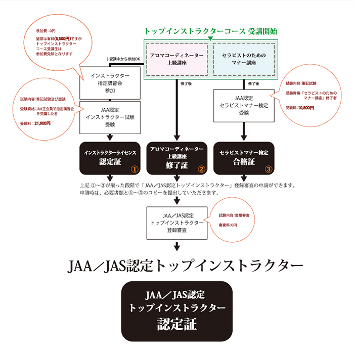 | インストラクター資格 取得の条件 | JAA正会員(アロマコーディネーター資格取得者)であること。 |